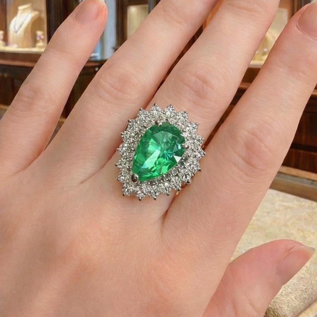 周囲には合計1.54カラットものダイヤモンドを贅沢にセッティング。繊細なメレダイヤが幾重にも連なり、白い炎のように輝きながらエメラルドの美しさを際立たせます。ペアシェイプカットのエメラルドと放射状に広がるダイヤモンドの組み合わせは、まるで王侯貴族のジュエリーを思わせるクラシカルな華やかさを演出します。