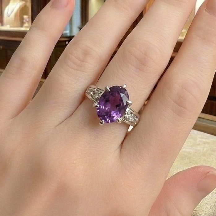 深く気品ある紫色が印象的な、天然バイオレットサファイアをあしらったプラチナリングです。