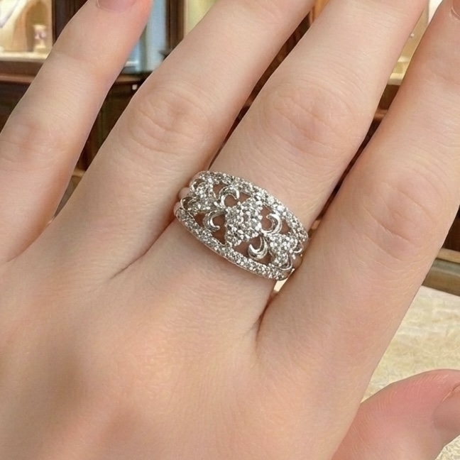 サイズは14.5号。幅広のフォルムながらも透かしデザインにより軽やかな印象で、女性らしい優雅さと存在感を兼ね備えています。結婚記念日や特別なギフト、自分へのご褒美ジュエリーとしてもおすすめの逸品です。