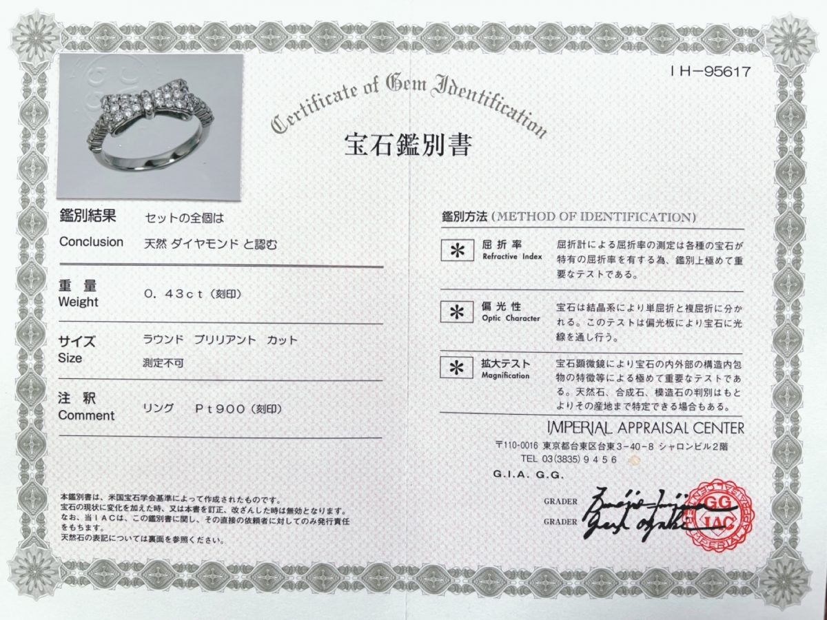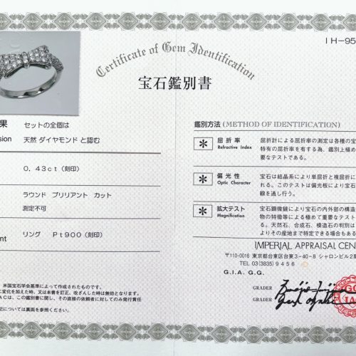 付属の鑑別書(IMPERIAL APPRAISAL CENTER発行)には、天然ダイヤモンドであることが明記されており、安心してお求めいただける逸品です。