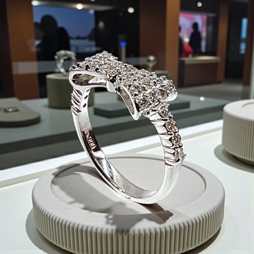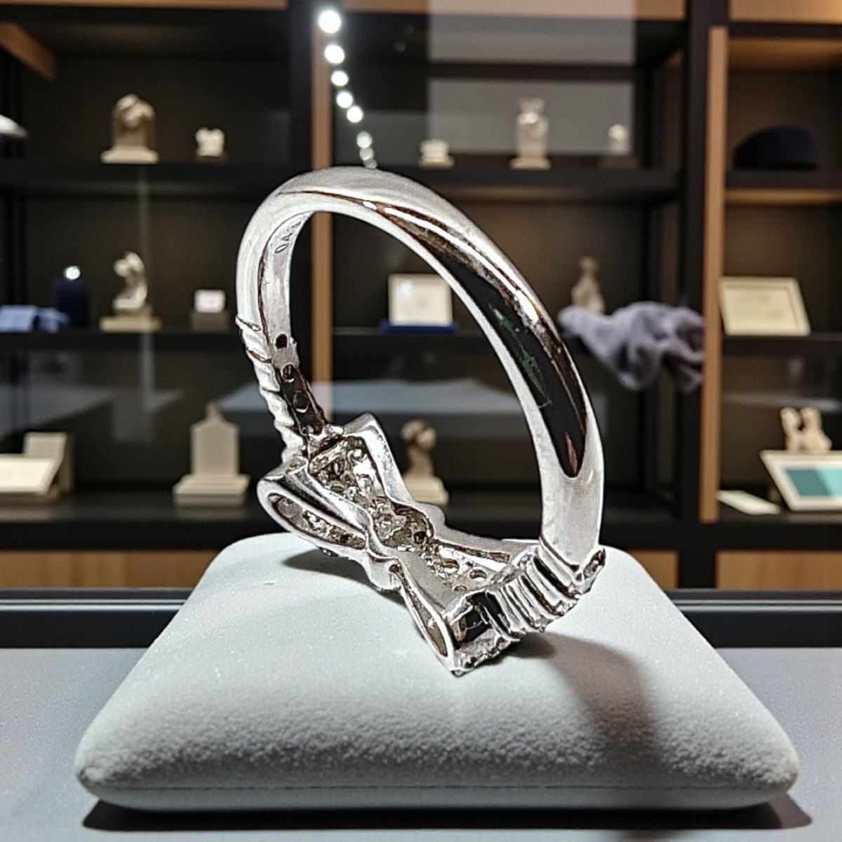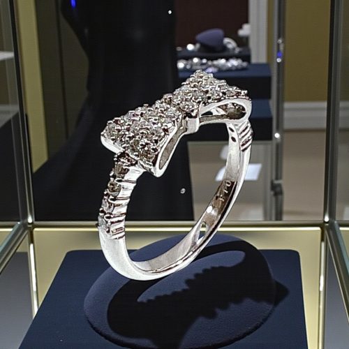 ひとつひとつの輝きが集まってリボンを形作るこのリングは、「幸福を結ぶ」象徴としても人気のモチーフ。