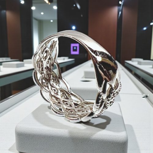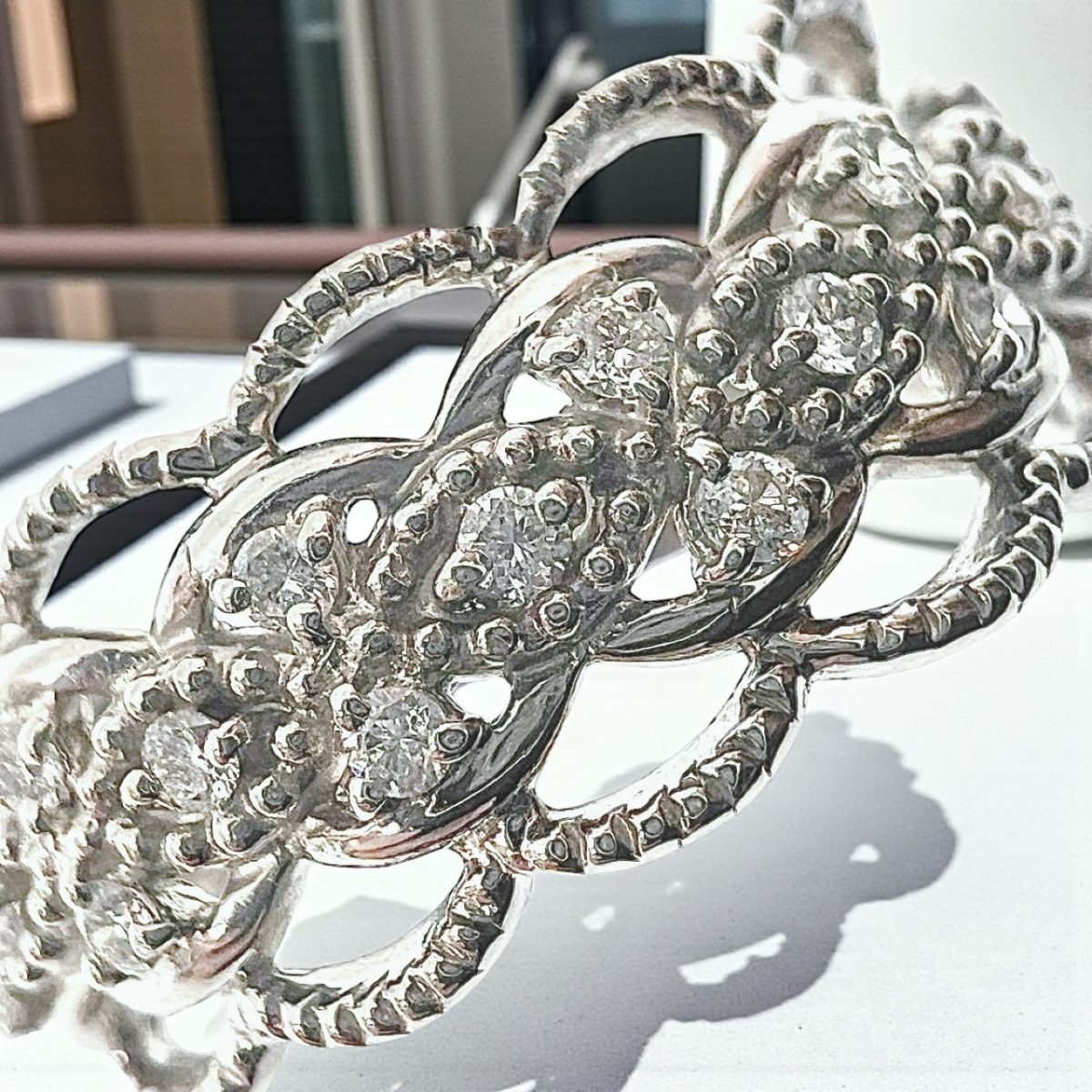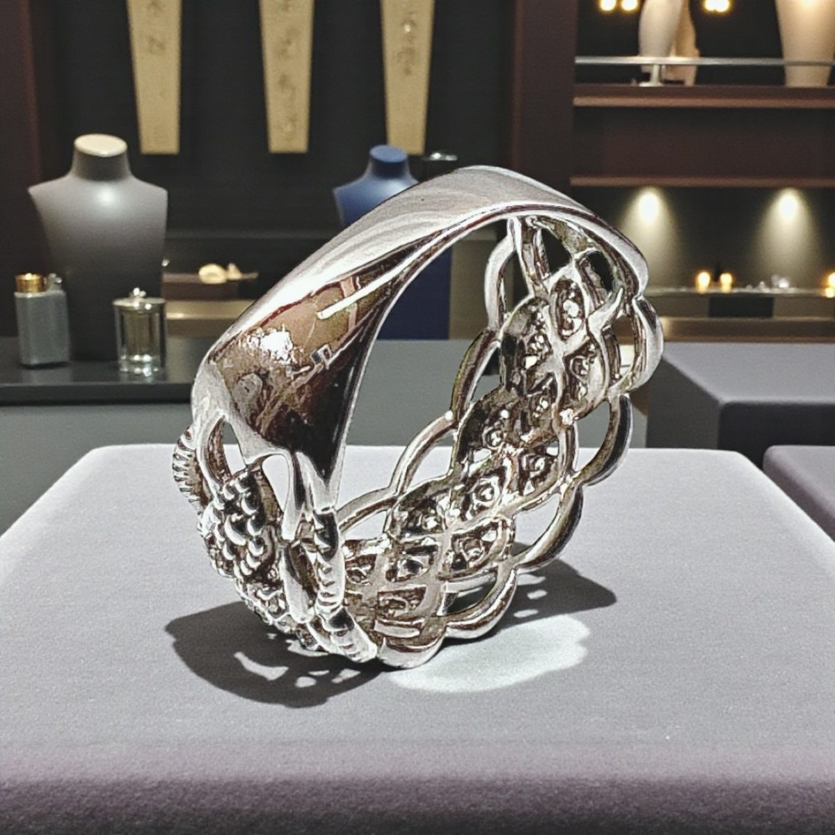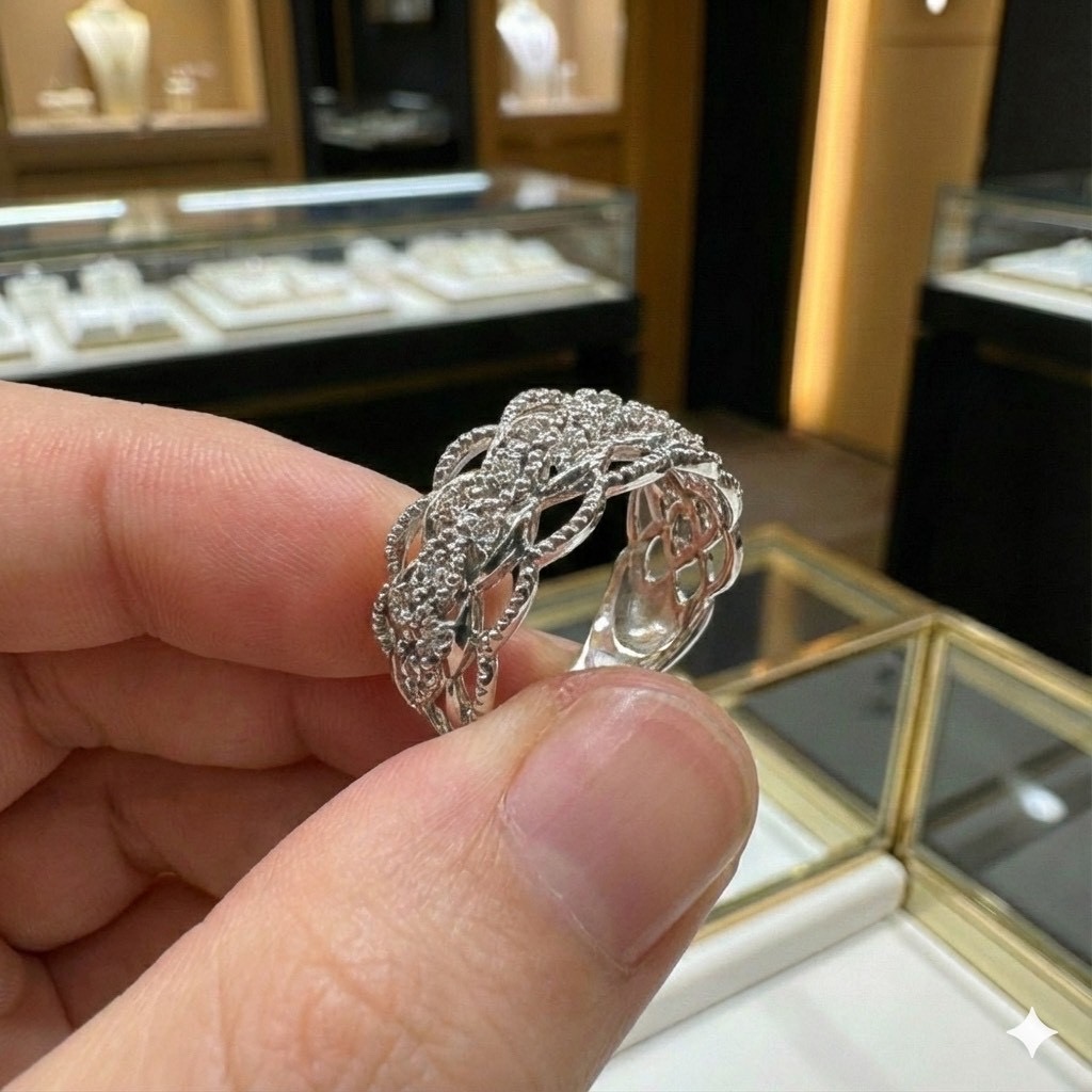 透かし部分の細やかな装飾が、職人の高い技術を感じさせる逸品。上品なミル打ち風の縁取りが光を柔らかく反射し、アンティークジュエリーのような趣を添えています。手元を優雅に彩るアクセントとして、フォーマルな装いにもカジュアルなスタイルにもマッチします。