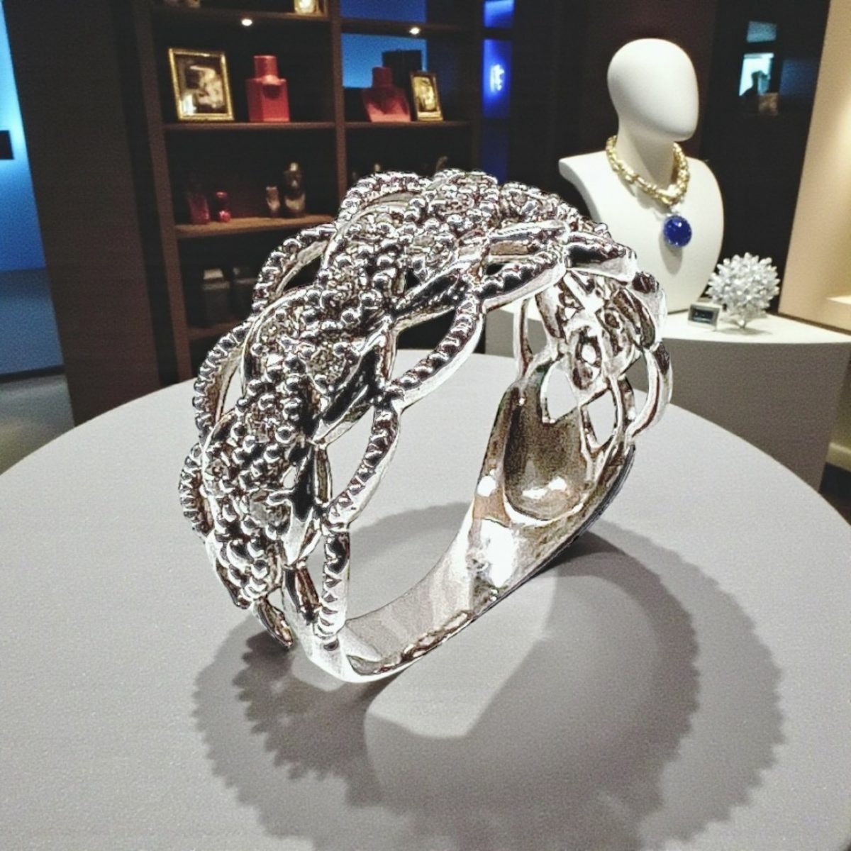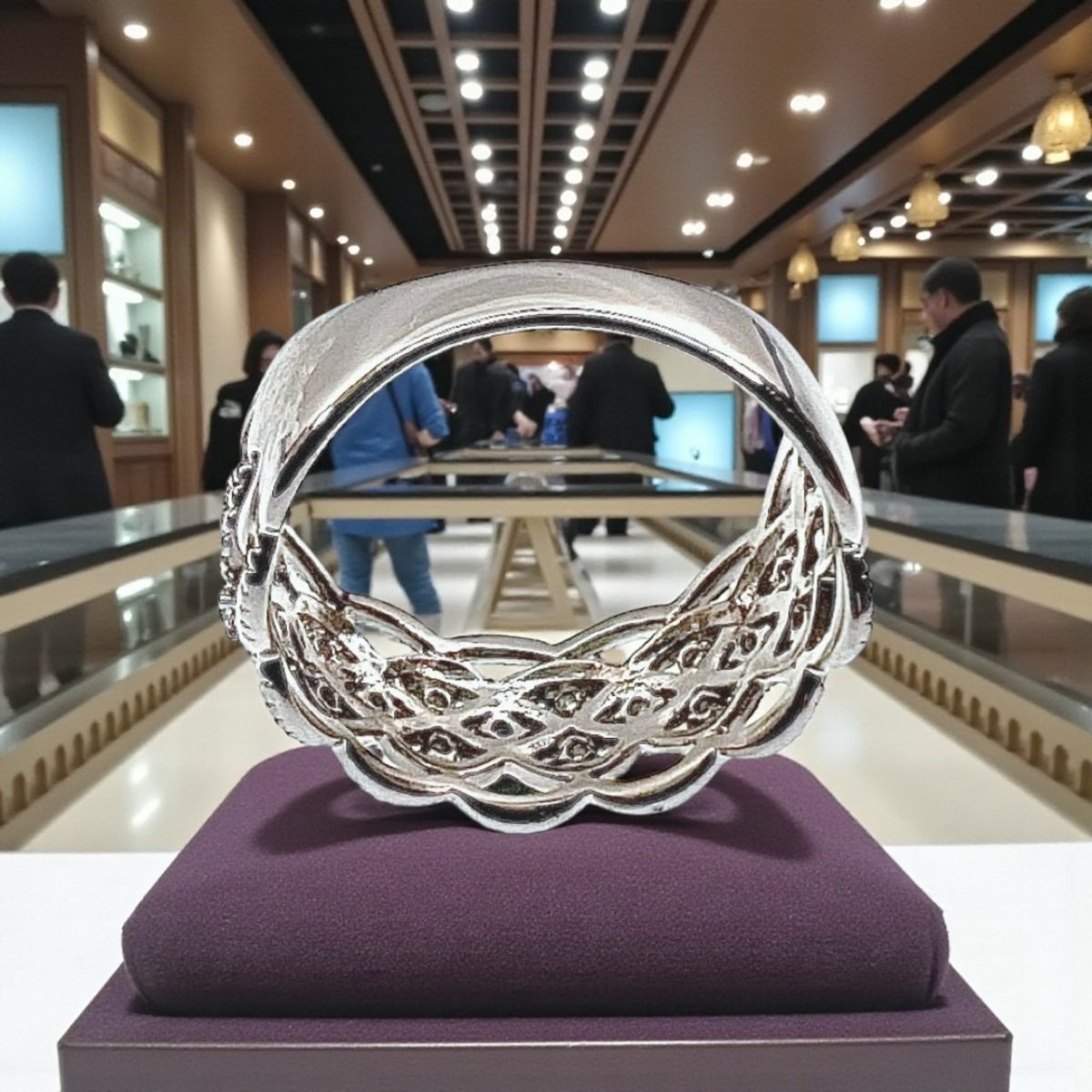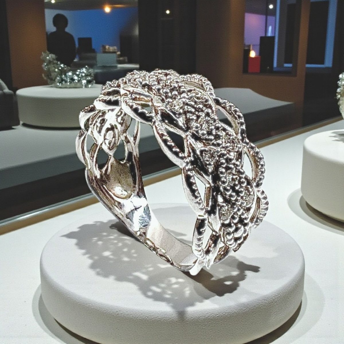 透かし部分の細やかな装飾が、職人の高い技術を感じさせる逸品。上品なミル打ち風の縁取りが光を柔らかく反射し、アンティークジュエリーのような趣を添えています。手元を優雅に彩るアクセントとして、フォーマルな装いにもカジュアルなスタイルにもマッチします。