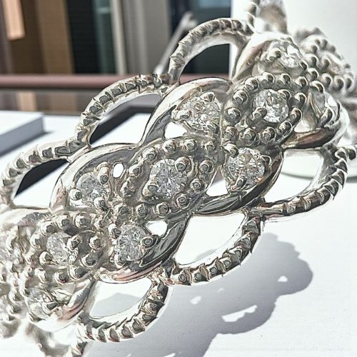 繊細な透かし模様の中に、天然ダイヤモンドを贅沢にセッティングしたデザインが特徴。クラシカルでありながらも、華やかさと気品を兼ね備えた仕上がりとなっています。