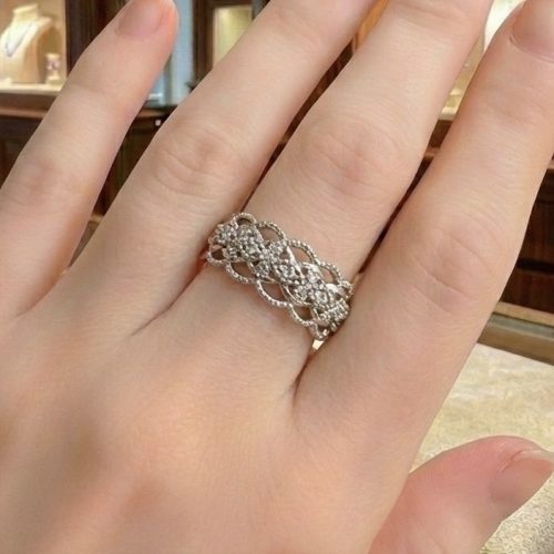 ダイヤモンドの輝きが織りなす立体的なデザインは、指元を華やかに演出し、見る角度によって表情を変えるのも魅力です。