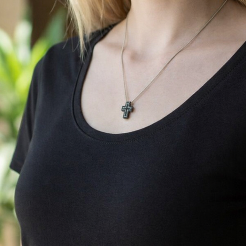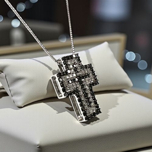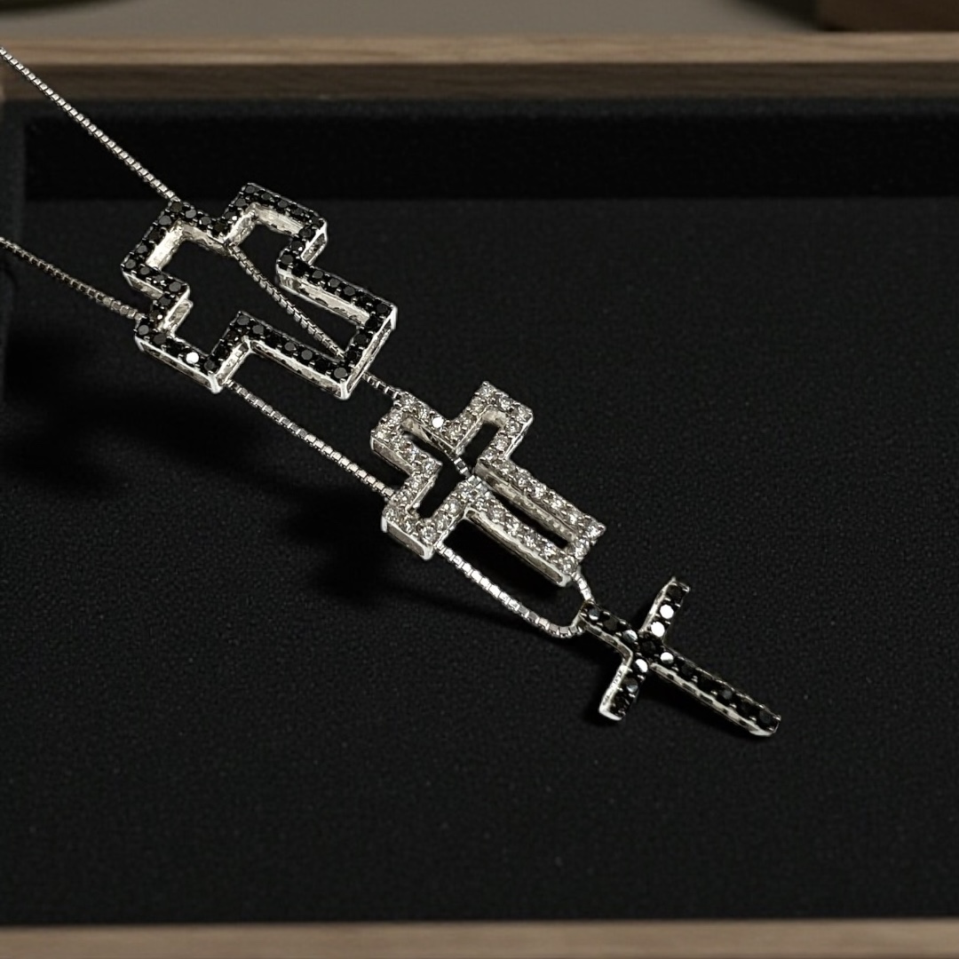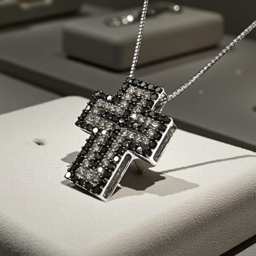 ブラックダイヤモンド特有の落ち着いた輝きと、ダイヤモンドの華やかな煌めきが融合した、大人のためのクロスペンダント。日常使いから特別なシーンまで幅広く活躍する、長くご愛用いただけるジュエリーです。