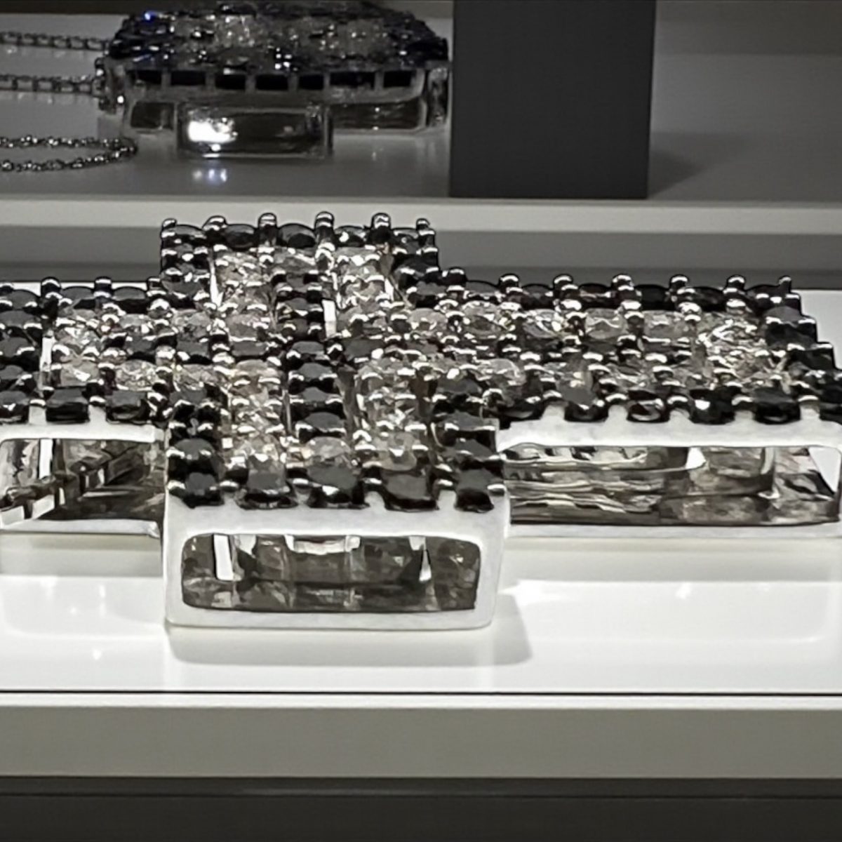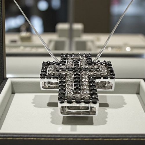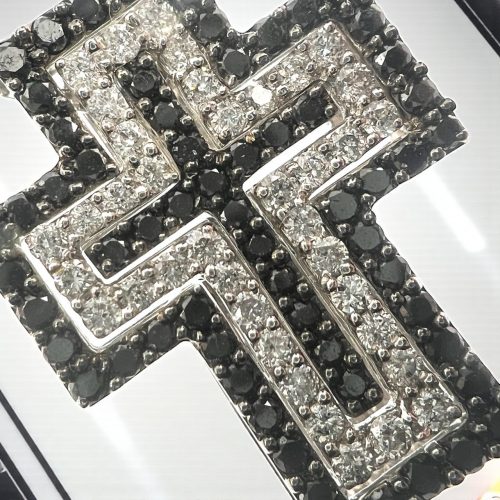 ブラックダイヤモンド0.46ct&0.16ct、無色ダイヤモンド0.38ctを使用した、存在感あふれるクロスモチーフペンダントです。