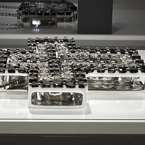 モチーフ全体に敷き詰められたブラックダイヤモンドとダイヤモンドが織りなすモノトーンの輝きは、力強さと上品さを兼ね備え、胸元に凛とした印象を与えてくれます。